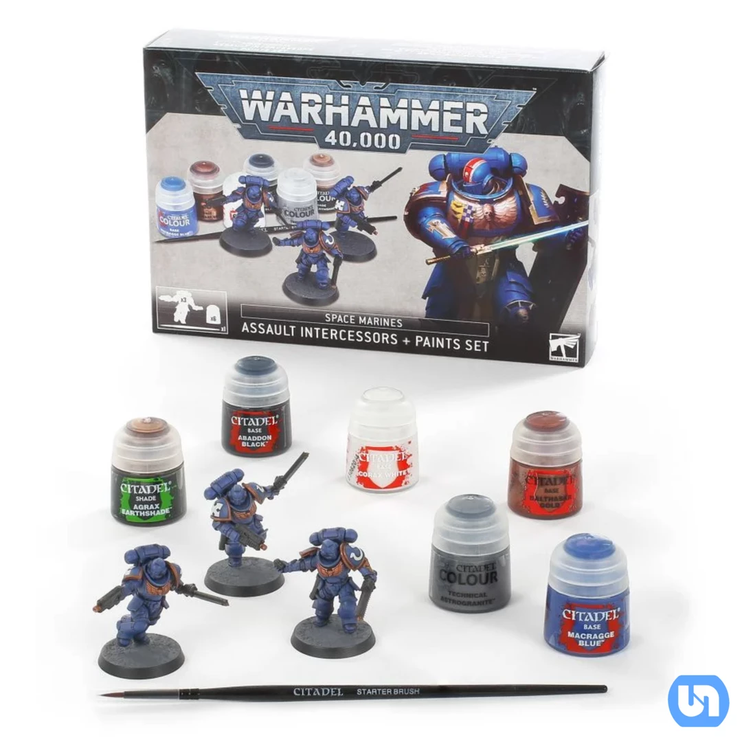 This box is the perfect way to start your collection of Primaris Space Marines. Youβll get three plastic Assault Intercessors with three distinct poses, the paints you need to prepare them for battle and a brush to get you started. These models are push fit, only requiring clippers to assemble β no glue, no mess.
