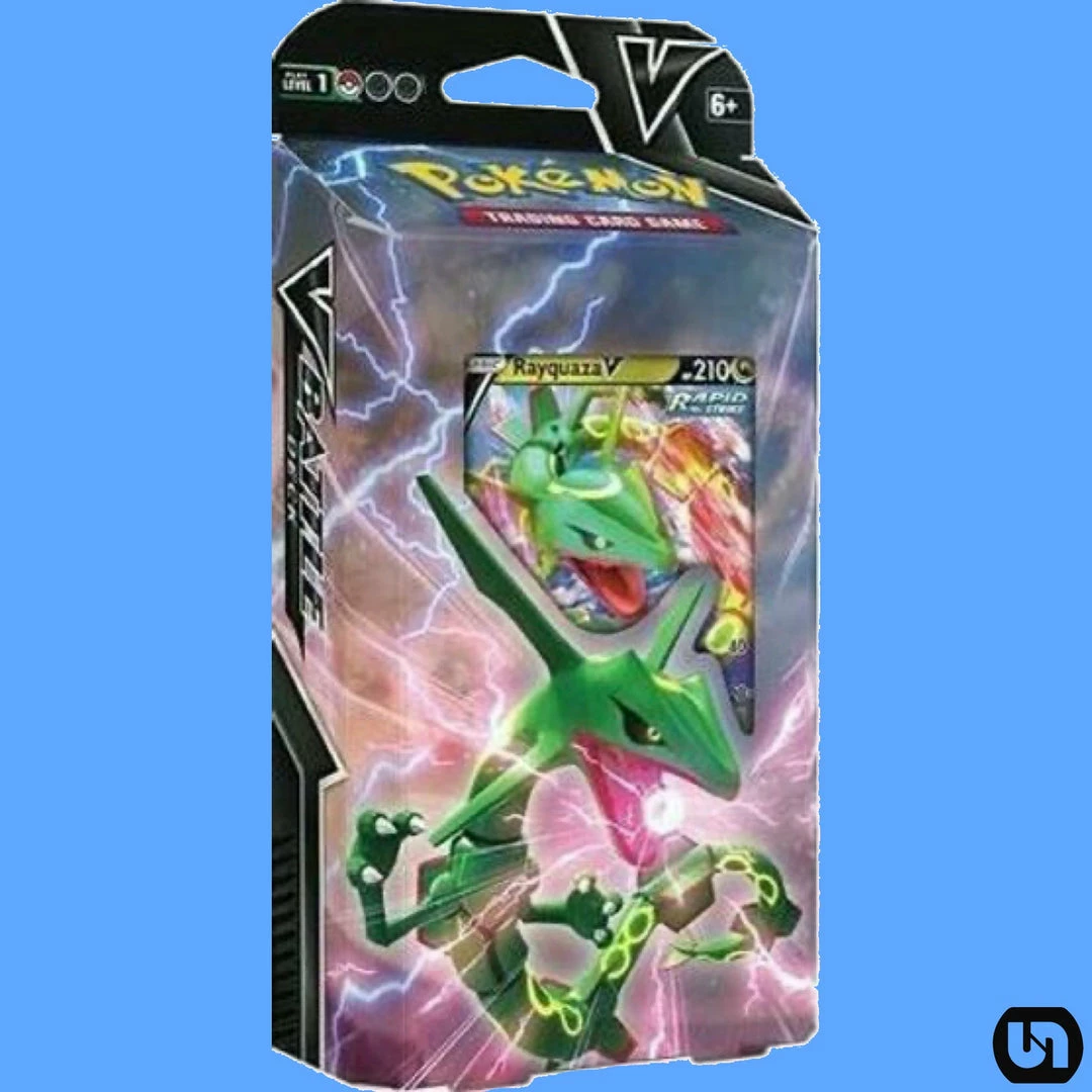 Welcome the return of Dragon types to the Pokemon TCG with a deck led by Rayquaza V! Turn your discards into damage with the star Pokemon’s Dragon Pulse and Spiral Burst attacks, dig into your deck for more Energy with the help of Gym Leader Goride, and combine the powers of Fire and Lightning in the Rayquaza V Battle Deck!