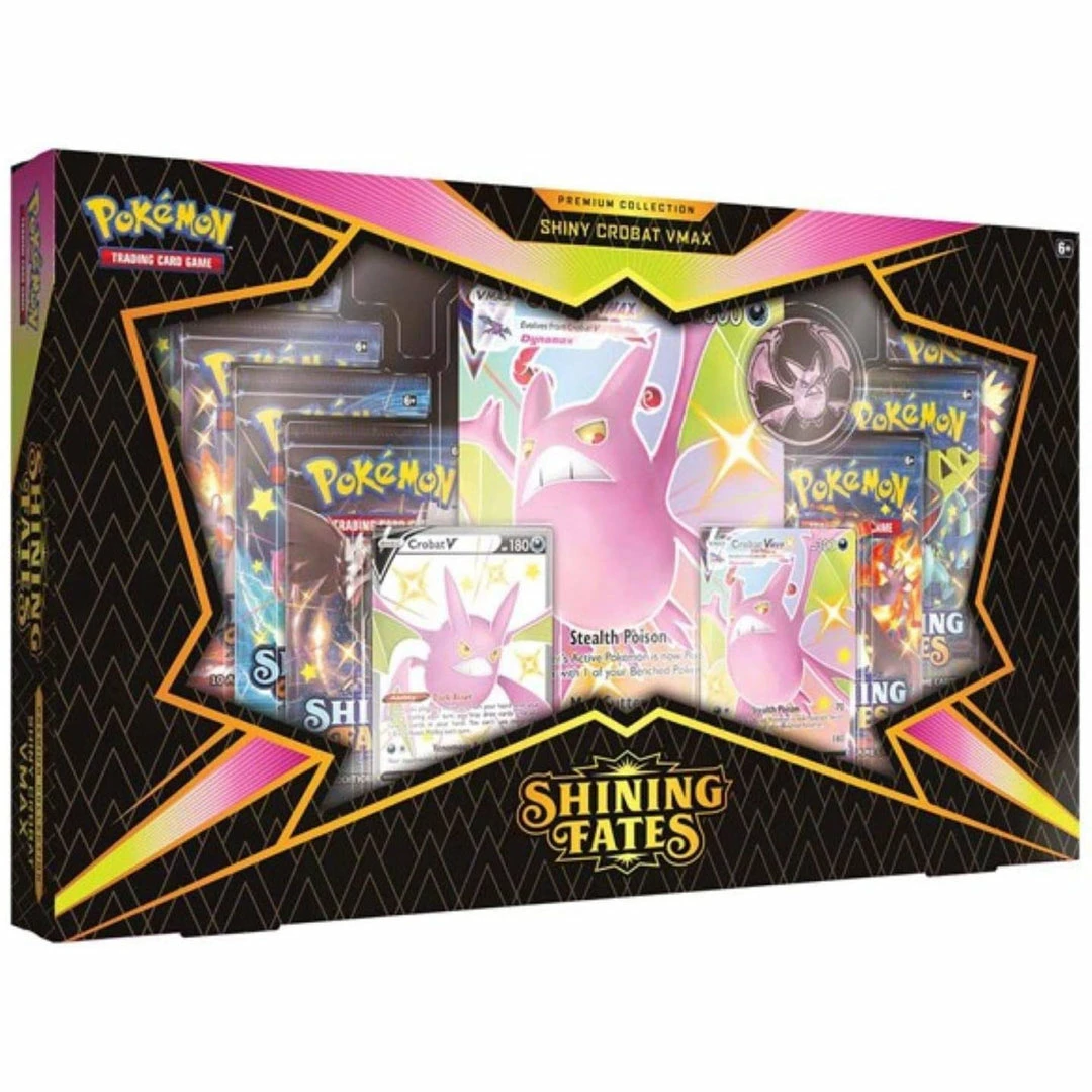 Discover a Shiny PokΓ©mon VMAX in These Shining Fates Premium Collections! Crobat VMAX or Dragapult VMAX swoops down from the sky with no warning to add a serious edge to your PokΓ©mon TCG teamβas an etched foil card in its Shiny color variation! Whatβs more, youβll find helpful allies, skilled Trainers, and other treasures in PokΓ©mon TCG: Shining Fates booster packs. Embrace the speed and daring of these Shiny PokΓ©mon VMAX, strike hard, and make your next PokΓ©mon battle one for the ages!