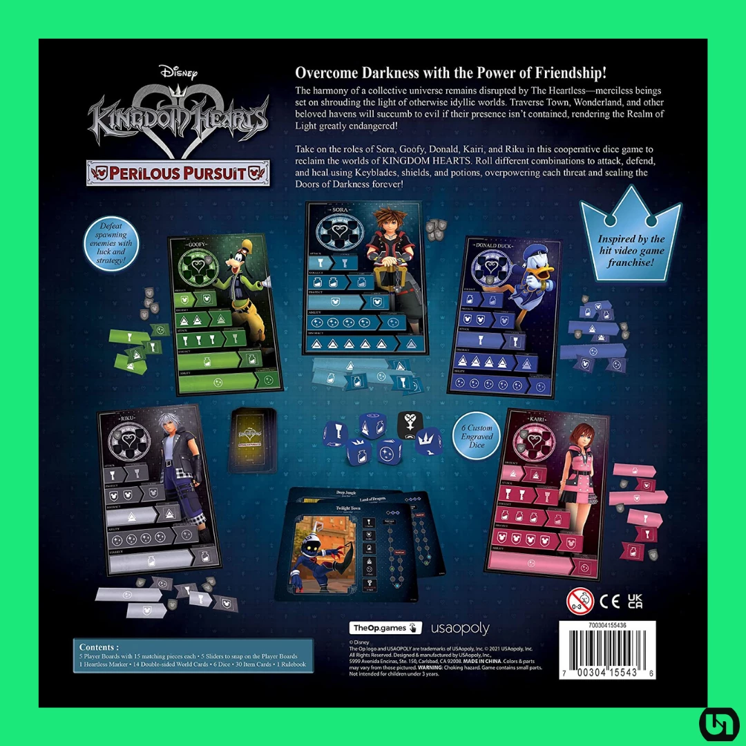 Take on the role of Sora, Goofy, Donald and Kairi & Riku on a journey through the memorable worlds of Kingdom Hearts and rid them of Heartless! Collect sets of dice and work together in this cooperative game based on the hit video game series to take actions to protect each other, attack Heartless, collect potions, and seal the door to save six worlds without letting the darkness take over!